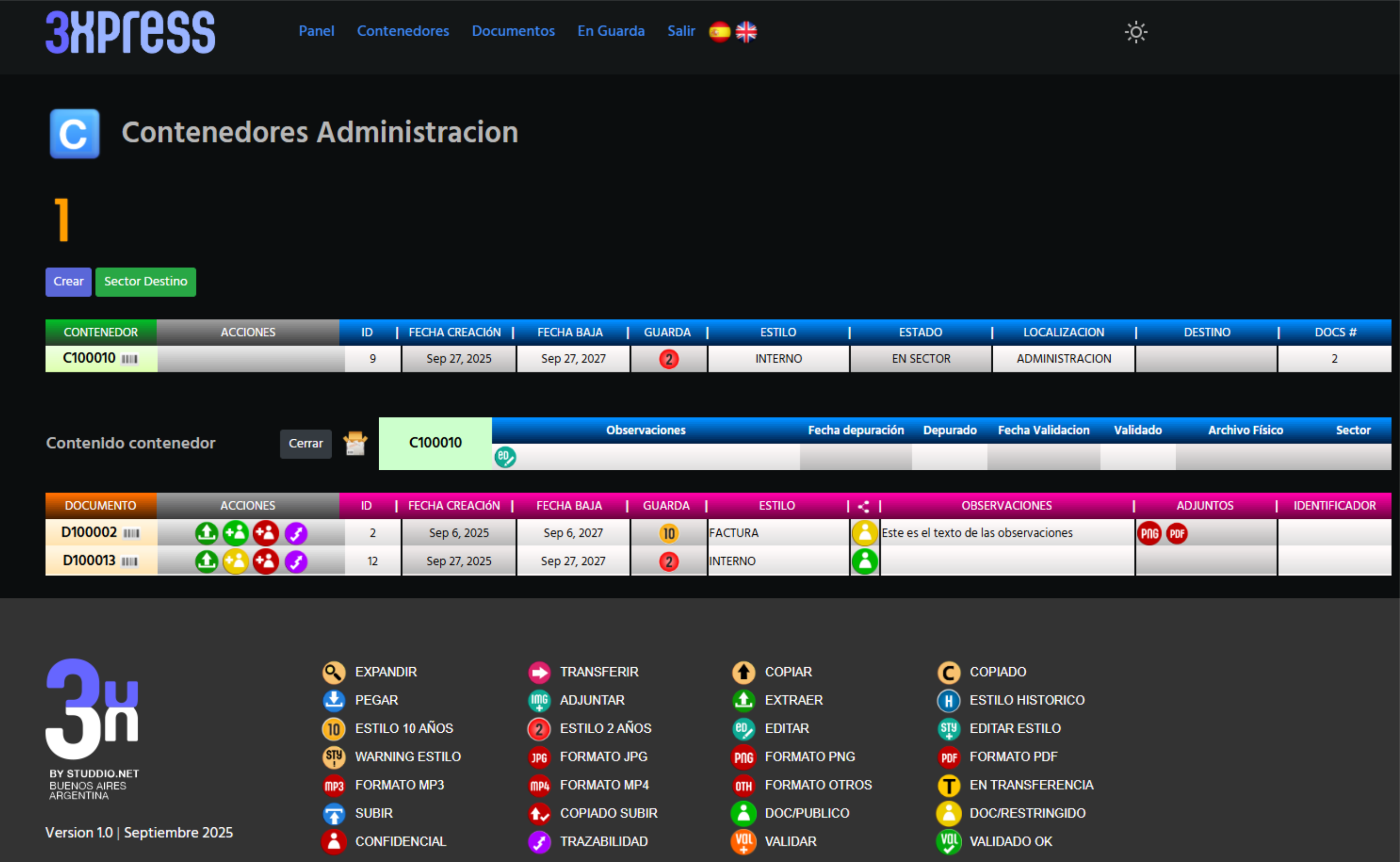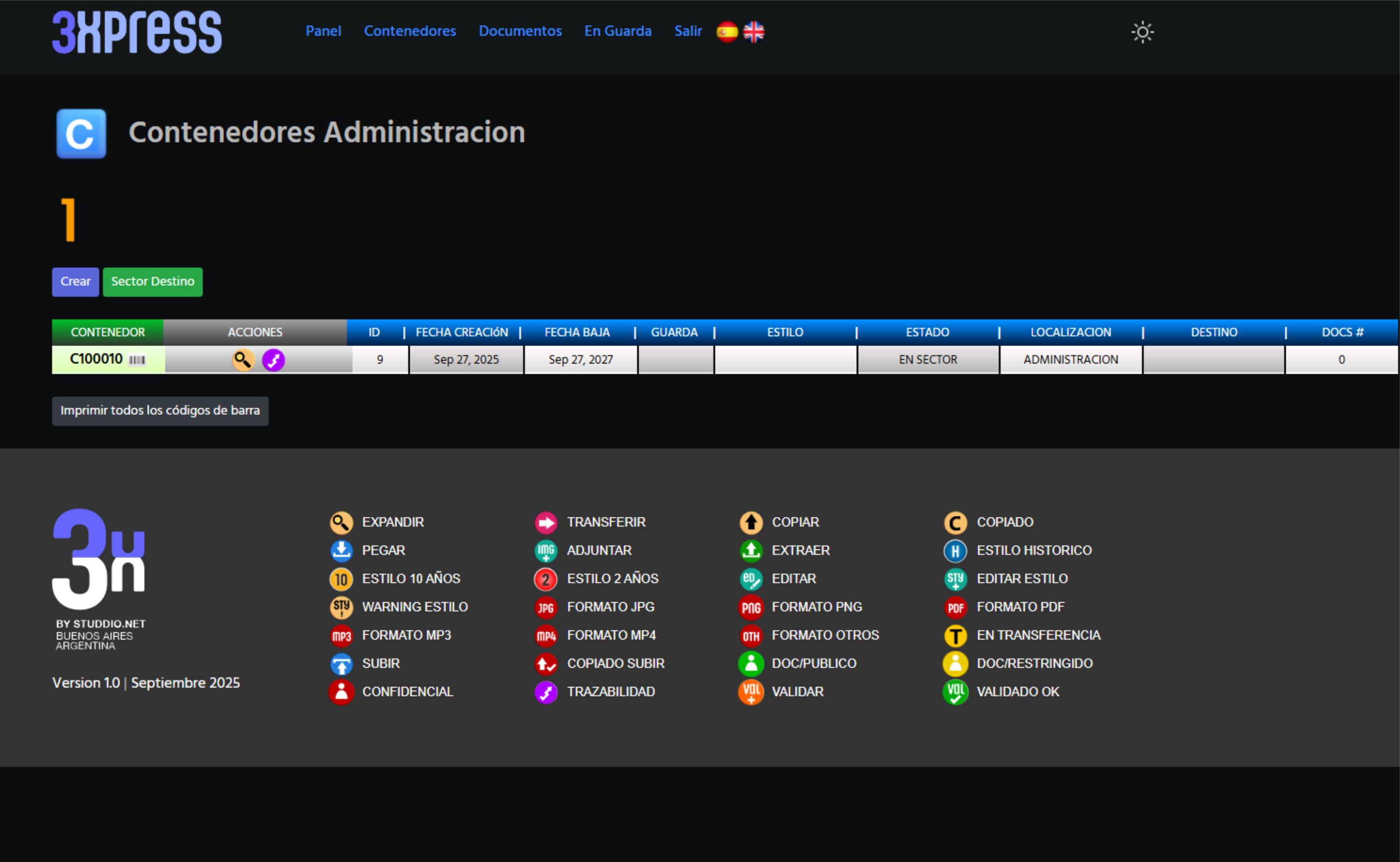 El apartado contenedores permite administrar la totalidad de contenedores del sector.