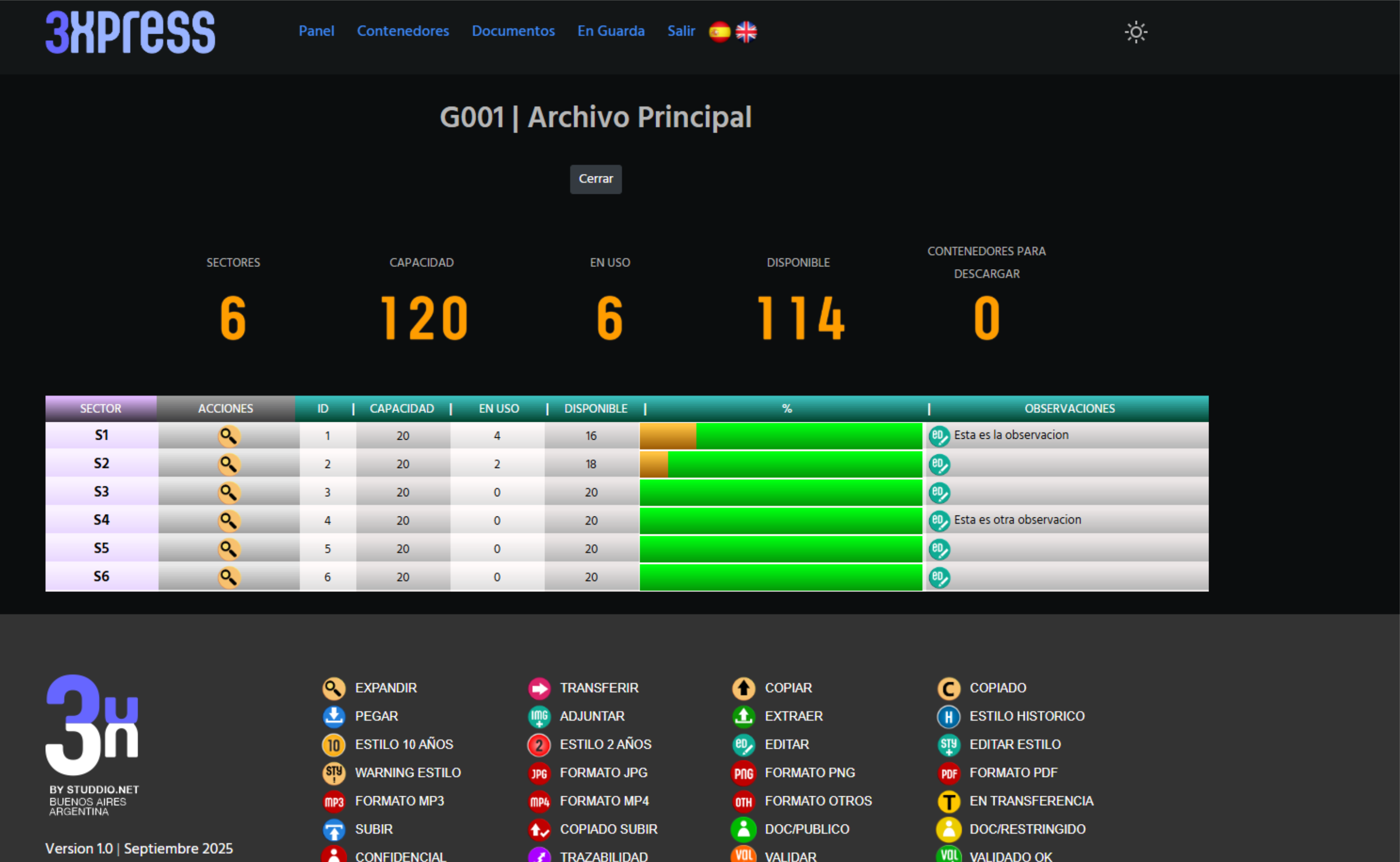 Esta es una imagen del apartado Depósito, donde se muestra la estructura de un depósito físico, con todos los contenedores guardados. Lógicamente, la funcionalidad es mucho más amplia.
